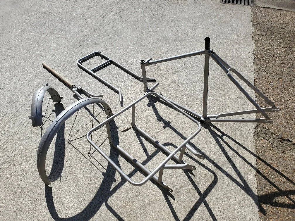 A Beautiful circa 1950’s Butchers Bike came into me in early January 2026 requiring a complete overhaul. First came the full strip down of the bike to bare nuts and bolts.
